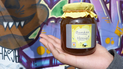 Wenn du einen kleinen oder auch größeren Betrag beisteuern kannst, danken wir dir herzlich für deine Unterstützung. Für Spenden ab 100 Euro gibt es ein ganz besonderes Dankeschön: ein Glas echten KEBAP-Bunker-Honig, den unsere Bunkerbienen im vergangenen Jahr gesammelt haben und der von Vera handgeschleudert wurde. Das Etikett hat Laura gestaltet. Nur die Gläser sind nicht mundgeblasen, ansonsten alles Handarbeit….