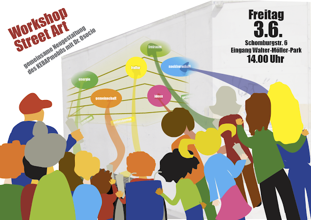 im Zuge unseres Beteiligungsprozesses im Stadtteil möchten wir gemeinsam mit Ihnen und euch vor Ort am Bunker eine einladende, alle ansprechende Atmosphäre schaffen. Unser KEBAPmobil – Anlaufstelle für alle Aktivitäten rund um KEBAP – soll dafür neu gestaltet werden. Der StreetArt-Künstler Dr. Ocioso zeigt uns, wie es geht und wir bemalen gemeinsam das Mobil mit Hilfe von im Workshop angefertigten Schablonen. Keine Vorkenntnisse erforderlich. Alle Interessierten sind herzlich eingeladen!