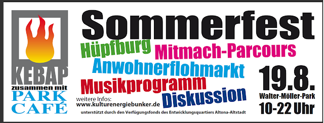 Für unser Sommerfest am 19.8. im Walter-Möller Park rufen wir (KEBAP e.V. und Parkcafe) zum Mitmachen auf. Eingeladen sind Anwohner, Initiativen, Künstler und Musiker, die ihre Ideen zum Fest beitragen wollen. Es wird eine kleine Bühne geben und einen Parcours, wo unterschiedliche Initiativen ihr Engagement vorstellen. Für das Programm zugesagt haben bereits die bekannten Poetry-Slammer „Schriftstehler“ und Sven Kamin, die Tüdelband mit ihrer aktuellen CD „NIELAND“ und das türkische Orchester Umuda Türkü.